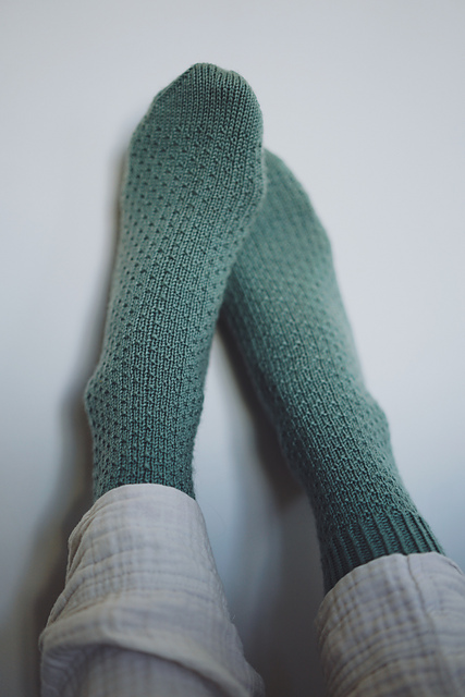 Worked cuff down, the socks combine a calm surface with thoughtful construction. The dotted texture flows naturally into a clean, wedge-shaped heel, where smooth stockinette highlights the structure and fit. The result is a pair of socks that feels simple at first glance, yet reveals depth and motion as you knit.