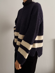 The pattern contains both a sweater and a slipover version. Both are knitted seamlessly, in stockinette stitch from the top down. The back is worked first, followed by the shoulders. Once the back and fronts are joined, they are knitted together in the round and finished with a hem knitted back and forth in a 1x1 rib to create side slits. The back hem is slightly longer than the front one.