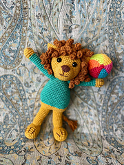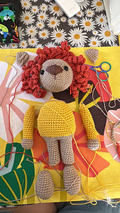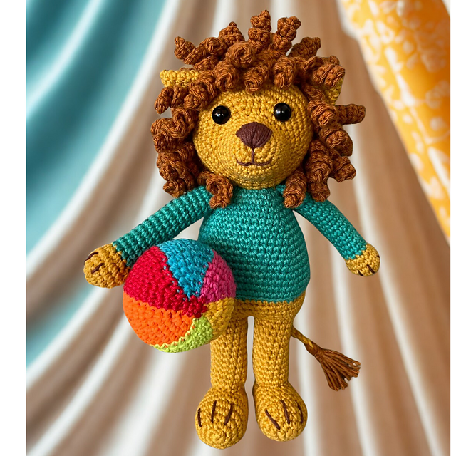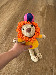 Tejeremos a Laionel, el león equilibrista, de la siguiente manera: comenzaremos con la cabeza, a continuación tejeremos el cuerpo y las piernas, haciendo los cambios de color indicados en el patrón. Los brazos los tejeremos de manera independiente. Coseremos la cabeza y los brazos al cuerpo, para finalizar tejeremos la melena.