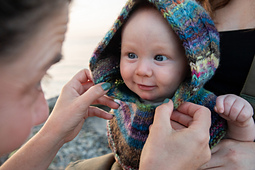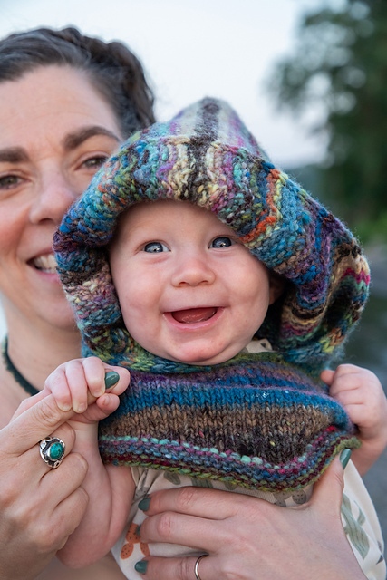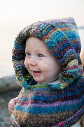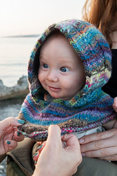 Baby Hoodola is cast on at the top of the hood and worked flat to the neckline with an optional decorative stitch to help the hood fit around the face. Then you join into the round and knit a yoke with short rows to cover the shoulders. The yoke tucks inside a coat or snowsuit perfectly, keeping that 'lil boo warm! Knit is a size bigger than your cutie and fold the edge of the hood back, as your babe’s noggin grows,they can wear it for more than one season!