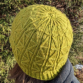 Twist in a Box is worked in the round beginning with twisted stitch ribbing around the brim. Single columns of stitches knit through the back loop divide the sections of twisted stitches. Decreases in pattern shape the crown.