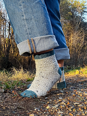 The Sendero Socks are knit cuff down and feature a 2x2 ribbed cuff, a variety of textured stitches, and a contrasting cuff, heel, and toe. The afterthought heel is constructed using waste yarn to keep stitches live, which are later picked up, shaped with decreases, and grafted together. The toe is shaped by working evenly spaced decreases for a rounded shape, finished by pulling through with the yarn tail. This pattern was knit using a combination of 23 cm / 9 in circular needles and DPNs, but your preferred small-circumference method may be used (magic loop, DPNs, 23 cm / 9 in circulars, or any other method).
