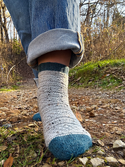 The sample was knit using Knit Picks Stroll Tweed in the colorway Down Heather for the main color, and Knit Picks Stroll in the colorway Rainstorm Heather for the contrasting color. The sample used approx. 176 yards / approx. 161 meters of MC and approx. 92 yards / approx. 84 meters of CC for size M. Keep in mind that your yardage/meterage will vary if you add length to the leg and foot of the sock.