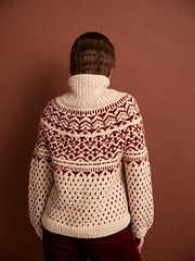 This colourwork sweater is worked seamlessly in the round from the top down. You can choose to work either a ribbed crew neck or a longer ribbed roll neck. After the collar, short rows are added at the back of the neck. The detailed colourwork yoke then begins, and graduates to a simpler colourwork pattern in the body and sleeves. There are two options given at the yoke for different yoke lengths. The sleeves are worked without shaping. The sweater has a loose shape and loose sleeves that go in slightly at the cuffs, which are finished with 1 x 1 Rib.