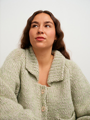 **Needles:** US 15 / 10 mm 32–40" / 80–100 cm circular needles for main fabric, US 13 / 9 mm 32–40" / 80–100 cm circular needles for rib, collar and buttonband, US 6 / 4 mm 32–40"/ 80–100 cm circular needles for spare needle (pick up edge of button band).