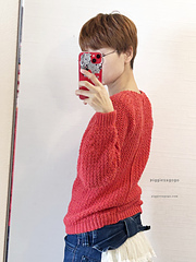 後ろ身ごろから始めて袖を編み出し、そのまま前身ごろに進んでぐるっと一周して編み始めに戻る、シームレスなパターンです。一度も糸を切らずに編み終えることができます。