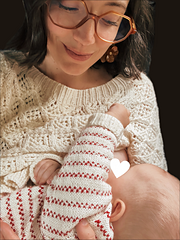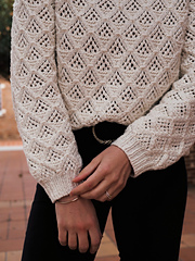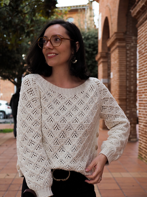 Le **Milky Sweater** est un pull raglan travaillé avec un très joli point dentelle sur l’ensemble de la pièce. Il dispose de deux pattes de boutonnage sur les côtés ce qui le rend compatible avec l’allaitement. Il a des manches ballons et une encolure arrondie plutôt large. Ce pull se tricote avec un fil type worsted, en une pièce, de haut en bas, avec une combinaison de tricot en circulaire et en aller-retour.