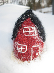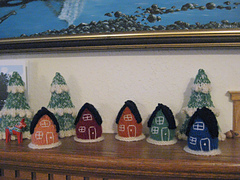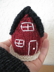 The bottoms are left open so that they stand well independently. The roof is knit flat in 2 pieces and joined together with a 3-Needle Bind-off. The embroidery is done with sock yarn and Long and Short Stitches.