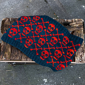The skull and crossbone design is created with stranded colourwork, together with duplicate stitching along two rounds (top and bottom).