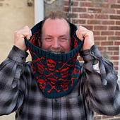 A generously sized cowl/snood featuring stranded colourwork framed by twisted-stitch ribbing.