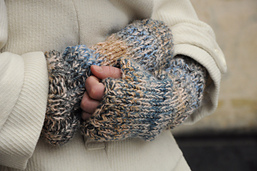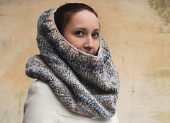 Both pieces are worked seamlessly in the round with two yarns held together, producing a thick, lofty fabric with a soft marled texture. Construction is simple and satisfying: the cowl is worked from the bottom up, while the mittens are worked from the cuff toward the fingers, with straightforward shaping for comfort and ease.