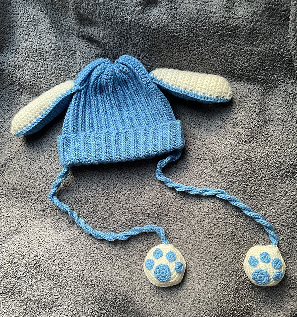 This project is intermediate beginner level. The hat is worked flat with half double crochets done in the third loop, then sewn up to take shape. Ear and paw attachments are made separately, then sewn on.