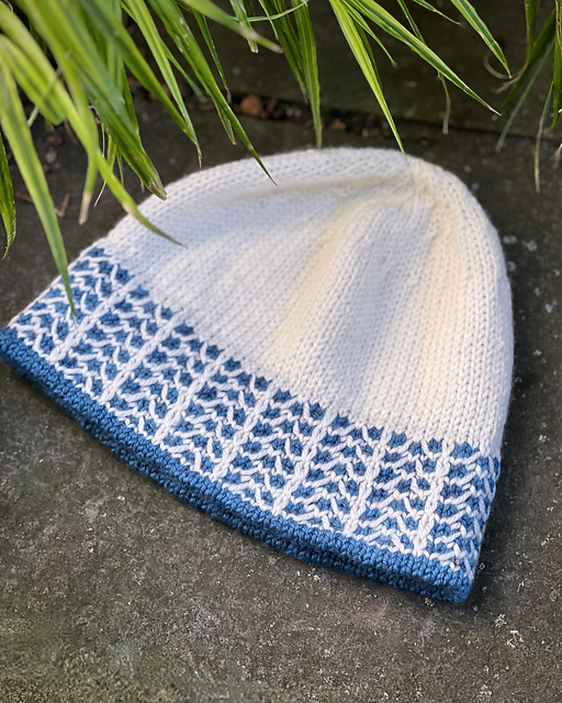 The Frostline Hat is a DK-weight beanie with a frosty slip-stitch pattern dancing around the brim. The colorwork is very easy to knit, using only one color per round. Inside, there’s a ribbed brim lining that is joined seamlessly as you go, giving you extra warmth and a soft, stretchy brim edge. The rest of the hat is worked in stockinette stitch, so you can knit to your desired height.