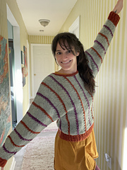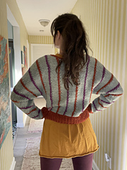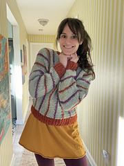 The Front and Back are knit with separate balls of yarn simultaneously while the neckline is shaped, then joined again to work the Right shoulder and sleeve. After the body is complete, the sleeves and sides are seamed. Stitches are then picked up and worked in the round in ribbing along the bottom waist edge and in garter stitch around the neckline.