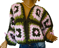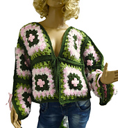 Wrap yourself in the gentle charm of spring with the Blossom Meadow Cardigan, a dreamy handmade piece crafted from vibrant granny squares in forest green, fresh meadow green, and soft pastel pink. Each square blooms with a sweet flower centre, framed by fluffy textured yarn that adds depth and a touch of magic.