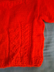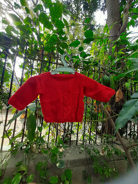 The Front piece and Back piece of the Main Body are worked flat on straight needles, bottom up, till the Top. Then the sleeves are worked flat on straight needles. Next the tops of the Back and Front right shoulder are sewn and joined using mattress stitch. Then the top part of the right sleeve is sewn to the opening of the right and front parts. Next the edges of the right sleeve are sewn, beginning from the cast on edge of the Cuff, till the armhole, and in continuation, the edge of the right sides of the Body are sewn to join the Front & the Back right part, till the cast on edge of the Border of the Main Body. The edges of the left sleeve are sewn till the armhole, and in continuation the sides of the left Front & Back Body are sewn, similar to the right sides. Only then is the Left sleeve sewn into the top opening of the Back & Front of the left side. The Left shoulder is not sewn because the Flap made on the Left Front Shoulder, gives extra room for the infant’s head to be inserted in the jumper easily. Lastly 2 small buttons are sewn onto the Left Shoulder of the Back part of the Body, which easily go into the Flap made on the Left Front Body part. Flat small shirt buttons work well for this purpose. The combination of cables with stockinette stitch is magical! This jumper works up extremely fast.