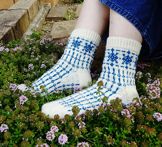The colorwork patterns of these socks were inspired by the boat wheel and quiet waves.