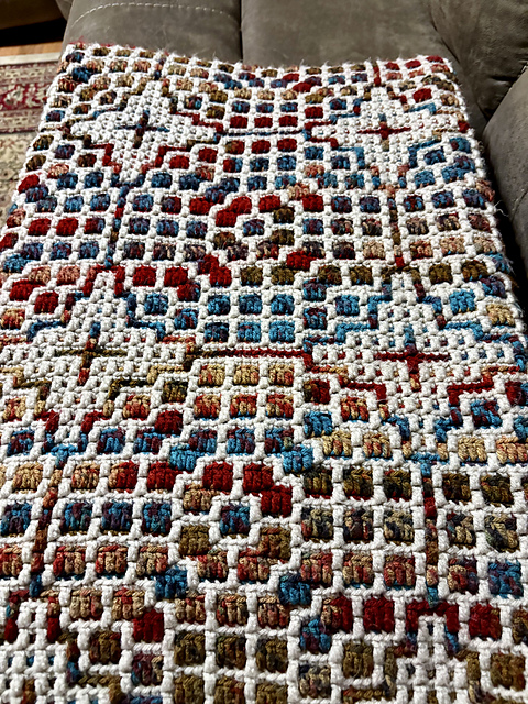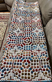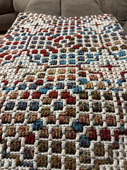 You can adjust the width/length of the blanket in increments of 9.5 inches (One shield), by adding/subtracting ONE (1) 38-Stitch/38-Row repeat. If you want to construct a bedspread-sized blanket, simply adjust the proportions of the pattern in 9.5-inch increments to allow the fringe to spill over the sides of the bed, leaving a clean edge top and bottom.