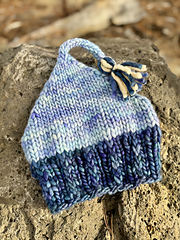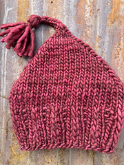 Beanie is knit in the round with a simple textured brim and decreased to form a lightly pointed top that is finished with a short I-cord and tassel. Pattern is knit with a four-stitch repeat, and very adjustable. The pattern details options for a cast on of 40, 44, and 48 stitches.