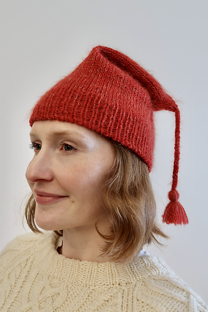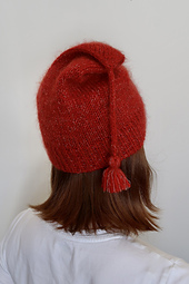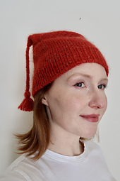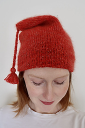 The hat begins with a Disappearing Loop CO. Sts are distributed evenly over Magic Loop needles and alternating increase/knit rounds are worked until you have the recommended or desired number of sts. The hat is then worked straight until it is 2.25”/ 6 cm shorter than your desired length. The remaining length is worked in 1x1 ribbing and the hat is BO with the Tubular BO method. I-cord sts are picked up and knit from the tip of the hat and your I-cord is worked to your preferred length. Finally, you make your tassel and attach it to the end of your I-cord.
