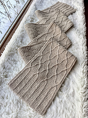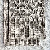 The scarf is knit flat from end to end using only knit stitches. Experienced beginners should have no problem with this pattern as long as they are familiar with slipping stitches with yarn in front and how to do a 1/1 cable.