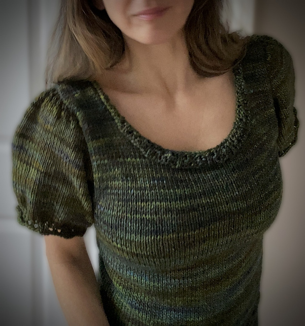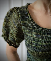 This delightfully feminine, form-fitting sweater is knit in the round from the bottom up to the armholes. It is meant to hit at the hip, but the length is easily adjustable to your preference.