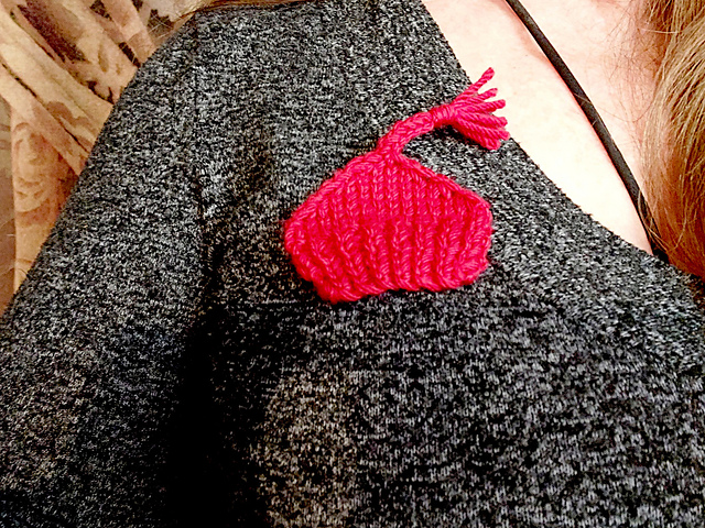 A tiny knitted symbol of solidarity, based on the nisse hat - a pointy red hat with a tassel that was worn by Norwegians as a sign of solidarity against the Nazis in WWII.