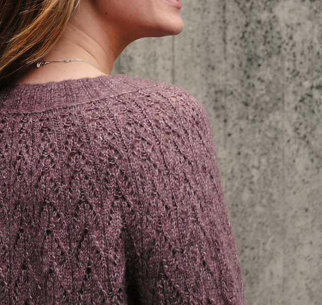 Oscillating is a circular yoke sweater featuring a delicate, undulating pattern of eyelet lacework. The lacework can be worked throughout the garment, or only in the yoke, with the upper body and sleeves gently transitioning to stockinette. Either way, the finished result is a comfortable yet elegant sweater that makes a versatile addition to your wardrobe from Autumn through to Spring.