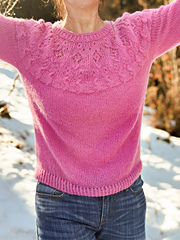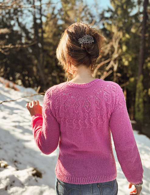 It has a romantic style, a series of simple stitches joined together decorate the yoke with pretty lace stitches and small cables.