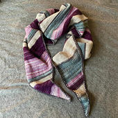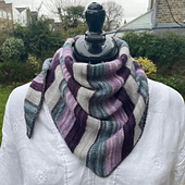 The design uses a Manos del Uruguay Fino multipack containing 5 x 20g of 3-ply merino-silk yarn, but will be a good project for any stashed or left-over light 3- or 4-ply yarns. An uneven stripe with colour pairs swapped at the mid-point creates two mirrored halves to use the short hanks to the fullest extent.
