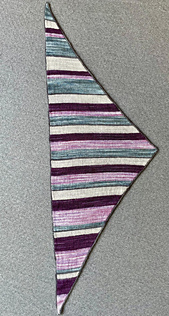 A 2-stitch Indigo intarsia border worked in garter stitch creates a frame around the main stocking-stitch striped area. It also provides a place to hide ends, as they disappear when woven into the catch line between border and main area. Many stripes are comprised of an uneven number of rows, to share the weaving in between borders. Working the intarsia is fiddly at the sharp ends of the triangle, as the border bobbins and main colour ball tangle easily. But there is good distance between them for 95% of the time. For the two-row Indigo stocking-stitch stripes, knit/purl across the main area using the yarn from one border, then knit/purl back using yarn from the other one, to keep the bobbins equally stocked.