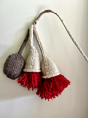 The flower and gum nut both begin with an i-cord. Increases are then used the shape both pieces, with the knitting continuing in the round. The flower head itself is created similar to a pompom. Hitch knots are used on floristry wire to create the branch.