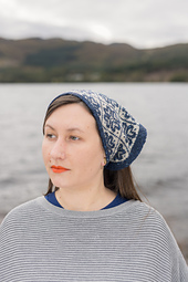 This triangular kerchief is knitted from long edge to tip, with a steek to enable working in the round. Stitches are decreased at an even rate along each side of the triangle and, after the final stitch is bound off and the steek secured and cut open, a garter stitch and i-cord edging is worked along each edge. I-cord ties enable the kerchief to be secured around the head or neck, and the steek can be finished with a ribbon facing, if desired.