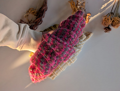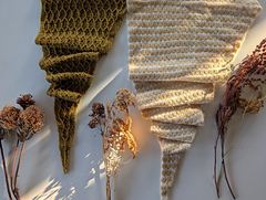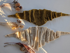 The slipped-stitch ribbed texture is worked in stripes, allowing the yarns to mingle and come together to create a beautiful tweed-like fabric, a subtle nod to The Woolly Good Gathering’s location and Scottish textile traditions. The edges of the shawl are worked in a neat i-cord and the deceptively simple stitch patterning soon becomes intuitive as the shawl grows.