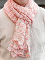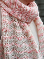The wrap includes stockinette, garter, and lovely feather and fan lace for a delicate finish.