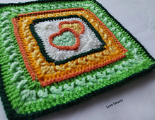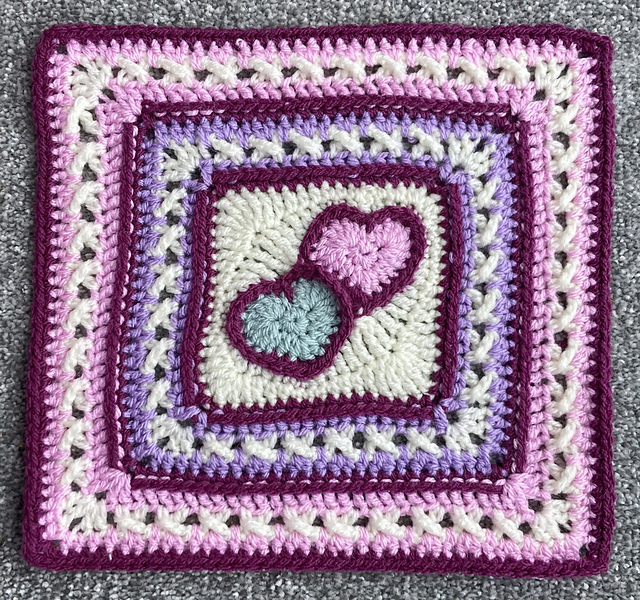Two little hearts, overlapped and surrounded by kisses form this afghan block which may be finished at 6, 9, or 12” for your sampler blanket. This pattern started life as an experiment in a design game in the BAMCAL 2025 group