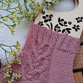 The Twisted Hearts Socks are worked cuff-down, featuring a modified Celtic Hearts cable pattern, on the outer edge of the foot. The placement is different on both socks.