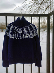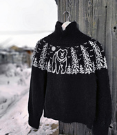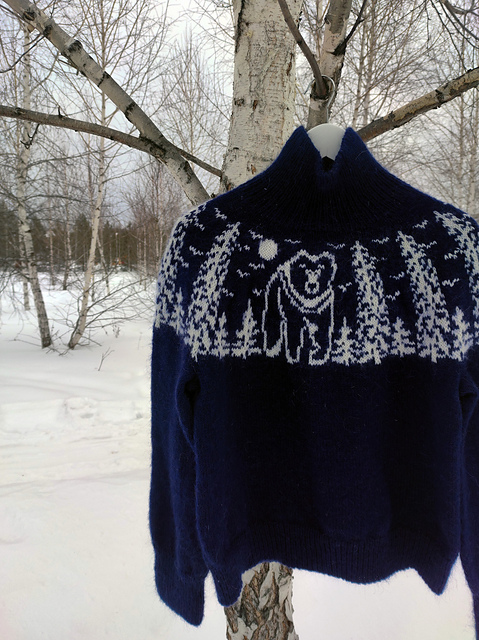 The sweater is worked in the round in a stranded colorwork pattern. The motif features repeating trees and birds, with a large bear emerging from the forest centered on the front. If desired, you can also knit the bear motif on the back.