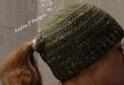 **Tired of trying to put a ponytail in those messy bun hats with the hole directly on top of your head? Check out this design created for normal ponytail placement. This hat is made to fit the average 22” female head circumference. Finished hat should measure approx. 8” tall by 10.5” wide at the brim and includes gauge measurements for the crown and ways to adjust the pattern to fit best.**