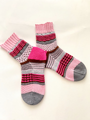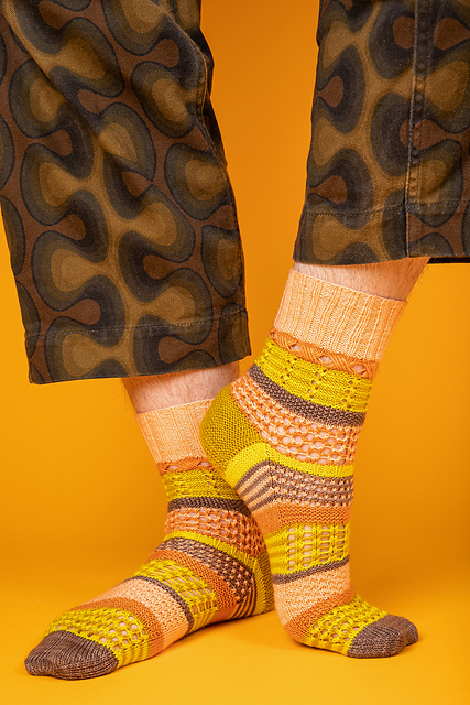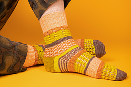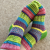 *These top-down socks are inspired by the Shawl Smorgasbord pattern to create some matching socks to your shawl. Begin with 2x2 ribbing followed by a smorgasbord of tantalizing textures. Elongated Criss Cross, eyelets, and seed stitch fill the leg of the sock followed by a garter stitch heel flap. Then the foot continues with more striped textures and little eyelet details. Put your feet up on the couch and enjoy some tv knitting with the colorful Sock Smorgasbord!*