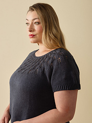 Orinne is a seamless top-down tee with a leaf-inspired lace adorning the yoke. Modern Cotton gives this project an easy elegance that will take you through whatever your summer days have in store, with its delicate sheen and crisp stitch definition that add an extra polish.