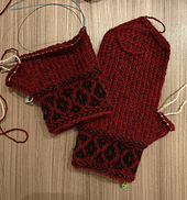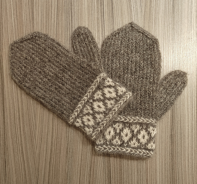 Mønsteret på mansjetten på disse vottene er hentet fra kapittelet «Rosebragd». På selve vottebladet og tommel har jeg brukt et flyttemønster som ofte blir brukt for å forsterke hæl. Dette gir et nær sagt dobbelt lag av tråder og votten blir tettere og varm.