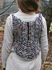 The vest is constructed from two identical front and back 'bibs' joined at the shoulder and under the arms. It is an ideal piece for using up leftover yarn as the rows look best worked in alternating, contrasting colours and/or textures. It is a made-to-measure garment that can be fit to the desired size.