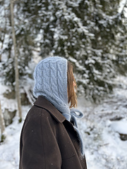 A timeless cable hood / bonnet with long ties, worked in mohair and double silk mohair for a light feel and a soft halo look.