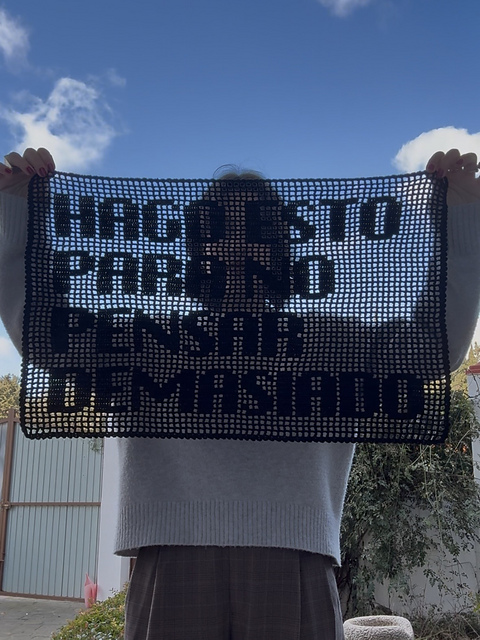 It combines traditional filet crochet structure with a contemporary, graphic approach.