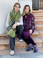 There are two versions of the Brioche Twist Scarf; one in bulky and one in super bulky. The purple one shown is knit in Bulky yarn and the green and grey one is knit in Super Bulky.