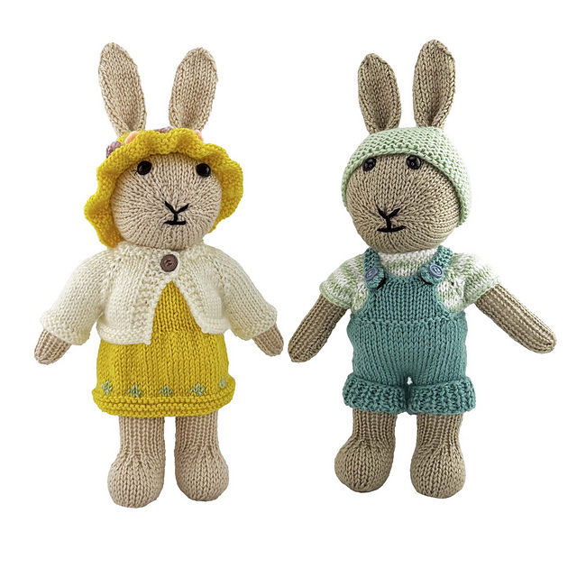 Bunny rabbits knitting pattern for Bramble and Blossom, both are approximately 23cm (9 inch) tall to the top of their heads.