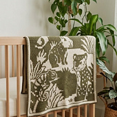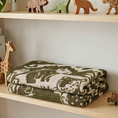 The blanket features a capybara, toucan, monkey, jaguar, and chameleon, creating a cheerful jungle scene.
