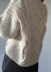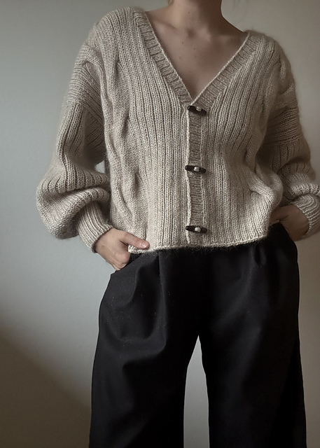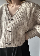 Der startes med at lave masker til nakken, hvorefter skuldrene og senere forstykkerne udformes med løkkeopslag. Når ryggen er færdig, strikkes der masker op til skuldre/forstykker samtidig med at der laves udtagninger til den dybe V-udskæring. Cardiganen strikkes frem og tilbage i ribstruktur og snoninger. Der strikkes masker op til ærmer og knapstolpe.