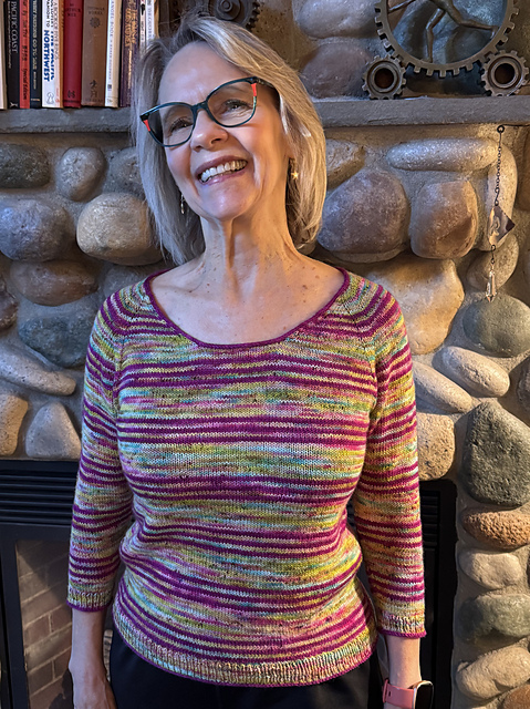 **Meet String Theory!** — a hand-knit celebration of color, movement, and joyful simplicity. Featuring three stripes and easygoing 3/4 sleeves, this tee is perfect for layering, lounging, or dancing through your day. Designed for comfort and charm, it’s a rhythmic knit that sings with every stitch.